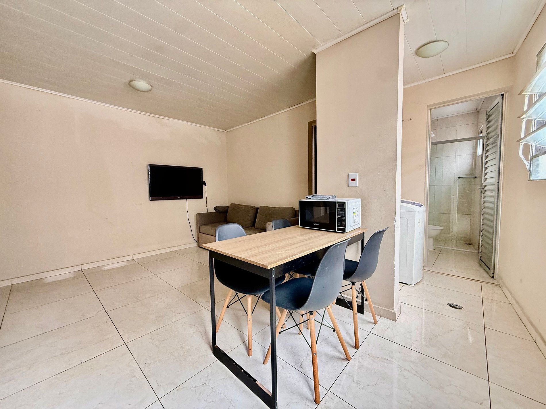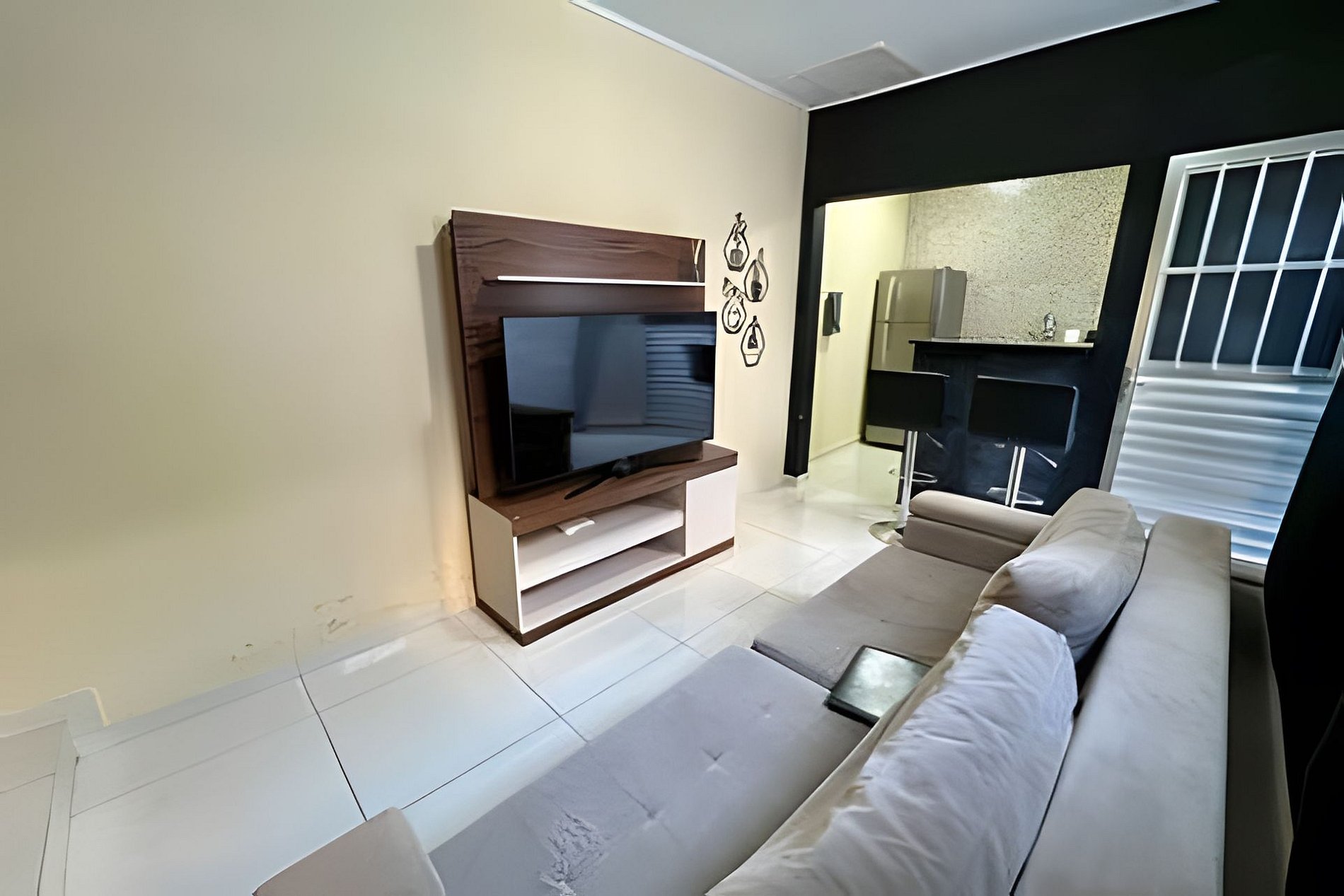 Acomoda até 4 pessoas, com 1 cama de casal e 1 sofá-cama. A cozinha é completa, equipada com geladeira, fogão, micro-ondas, cafeteira, sanduicheira, airfryer, pratos, copos, talheres e utensílios diversos. Dispõe ainda de lavanderia individual e privativa, garantindo praticidade e conforto durante sua estadia. O ambiente é moderno, bem iluminado e excelente para estadias curtas ou longas.