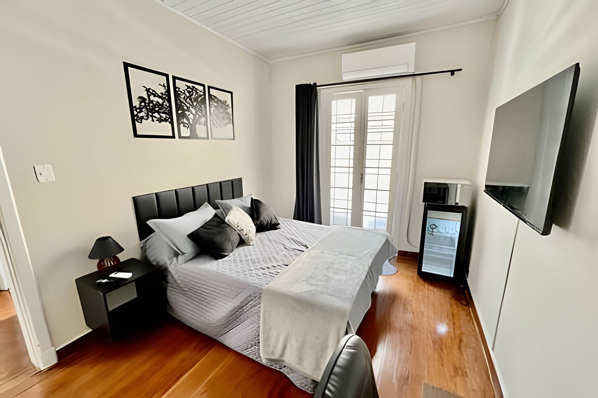 Acomoda até 2 pessoas, com 1 cama de casal, Equipada com frigobar, micro-ondas, cafeteira, sanduicheira, airfryer, pratos, copos, talheres e utensílios diversos. Conta com Wi-Fi, Smart TV, ar-condicionado e chuveiro