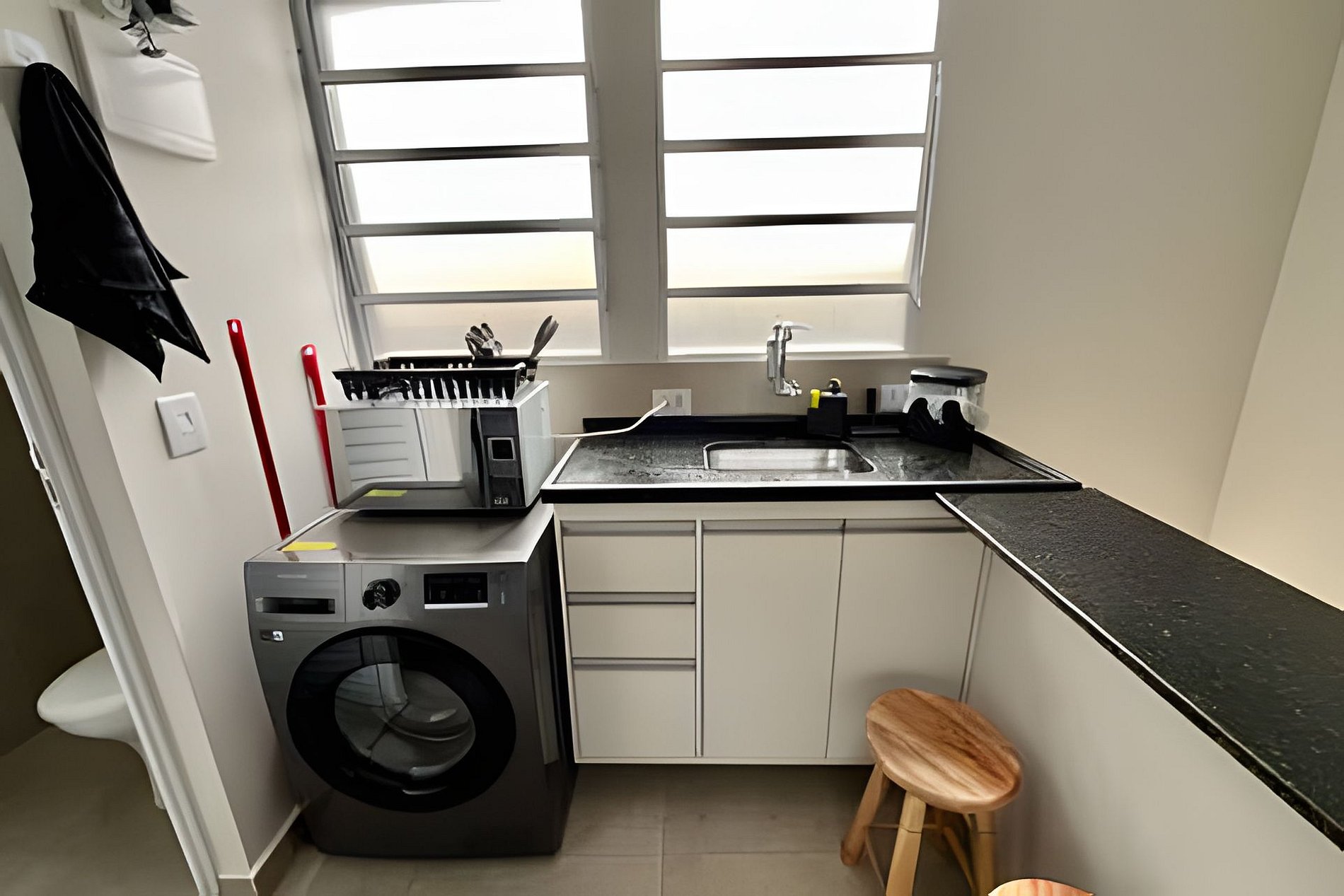 Acomoda até 2 pessoas, com 1 cama de casal. A cozinha é completa, equipada com geladeira, fogão, micro-ondas, cafeteira, sanduicheira, airfryer, pratos, copos, talheres e utensílios diversos. Dispõe ainda de lavanderia individual e privativa, garantindo praticidade e conforto durante sua estadia. O ambiente é moderno, bem iluminado e excelente para estadias curtas ou longas.
