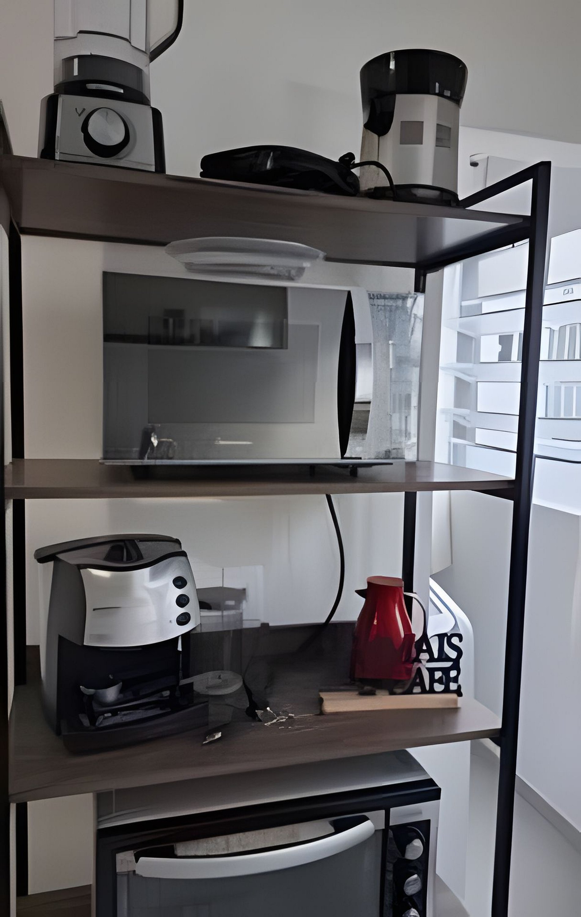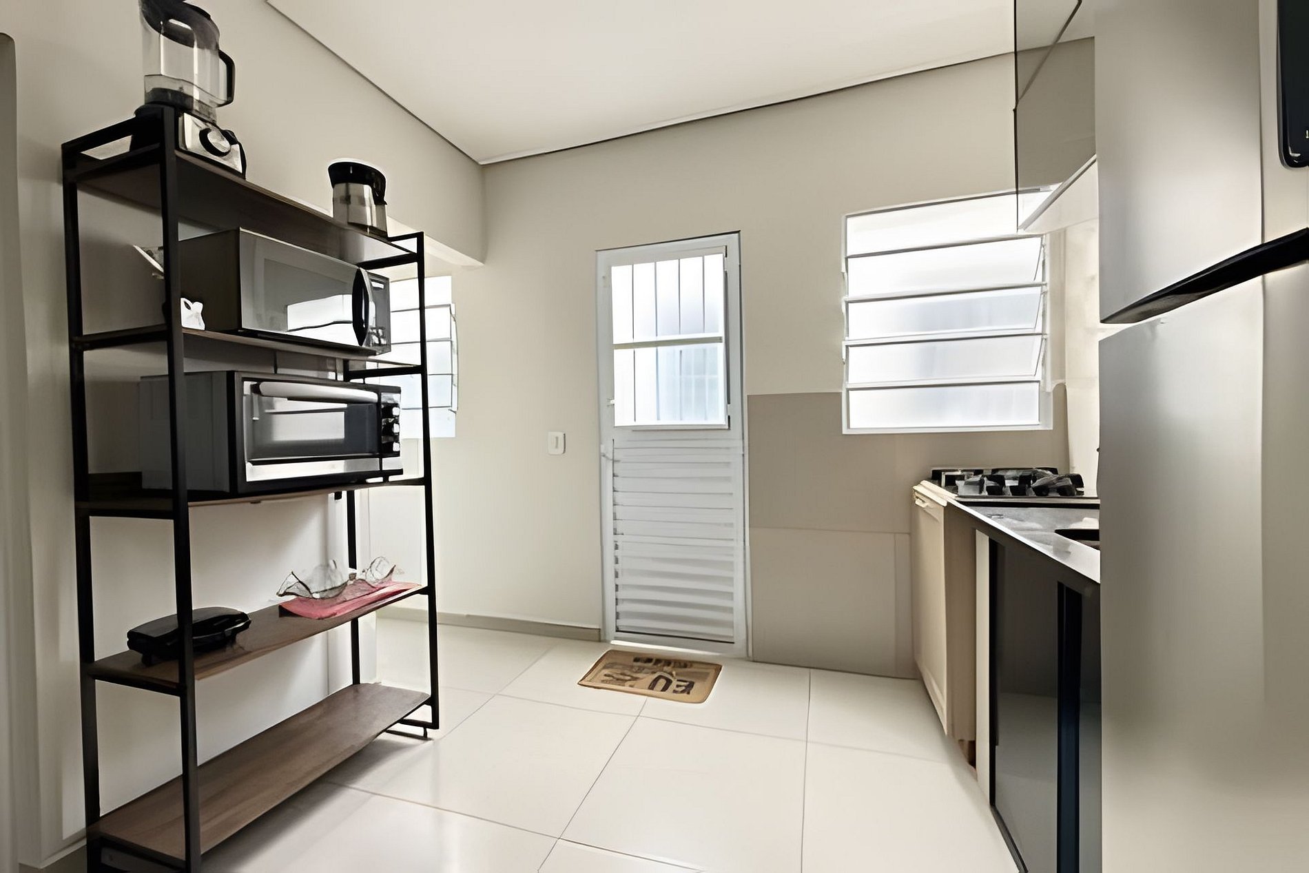 Acomoda até 2 pessoas, com 1 cama de casal. A cozinha é completa, equipada com geladeira, fogão, micro-ondas, cafeteira, sanduicheira, airfryer, pratos, copos, talheres e utensílios diversos. Dispõe ainda de lavanderia individual e privativa, garantindo praticidade e conforto durante sua estadia. O ambiente é moderno, bem iluminado e excelente para estadias curtas ou longas.