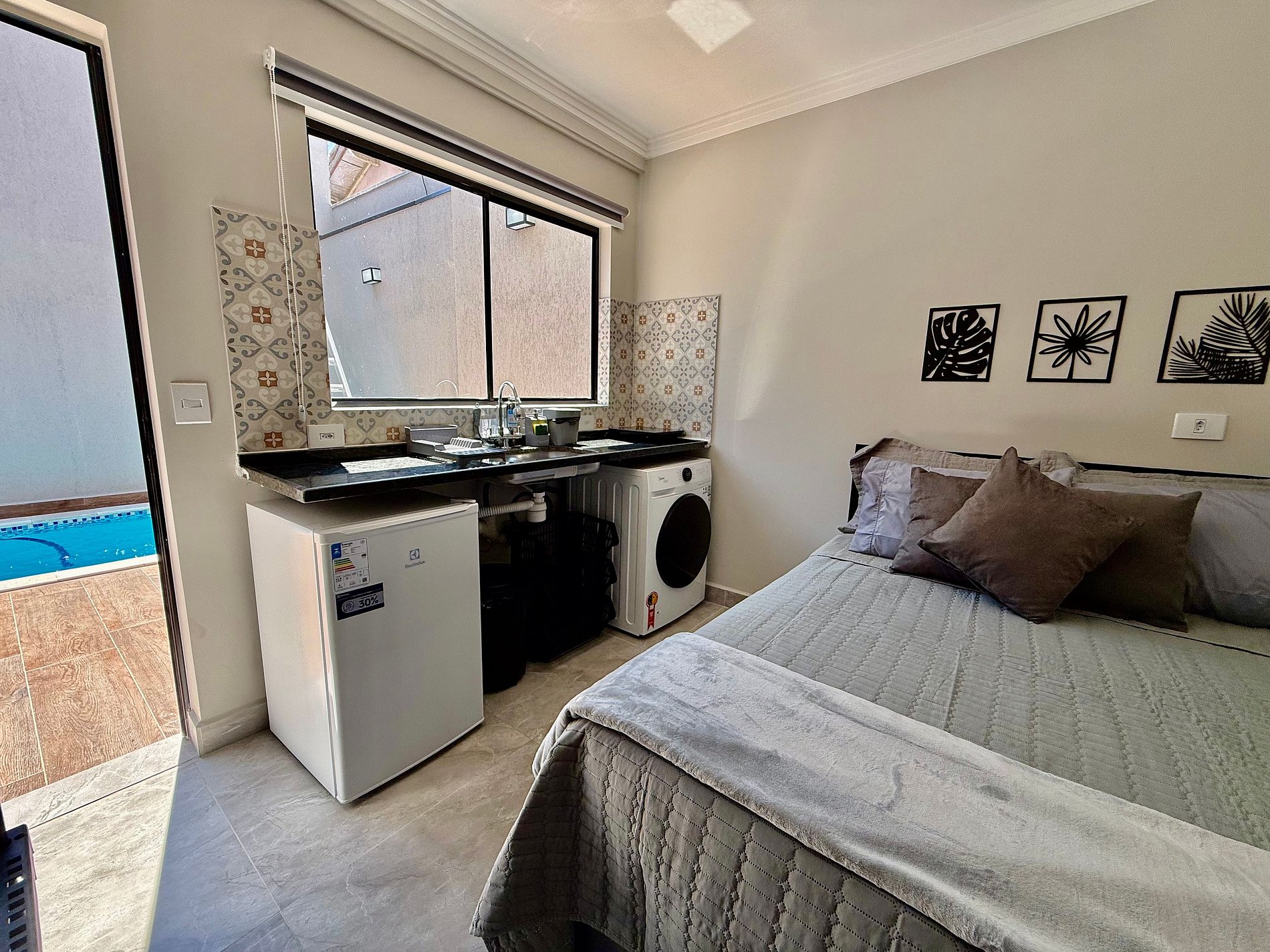 Acomoda até 5 pessoas, com 1 cama de casal e 1 triliche. Cozinha equipada com geladeira, fogão elétrico, micro-ondas, cafeteira, sanduicheira, airfryer, pratos, copos, talheres e outros utensílios. Possui piscina climatizada solar, Wi-Fi, Smart TV e chuveiro quente. Localização privilegiada, a 200 metros do Museu do Ipiranga, próximo a bares, comércios e restaurantes. Toalhas não são fornecidas.