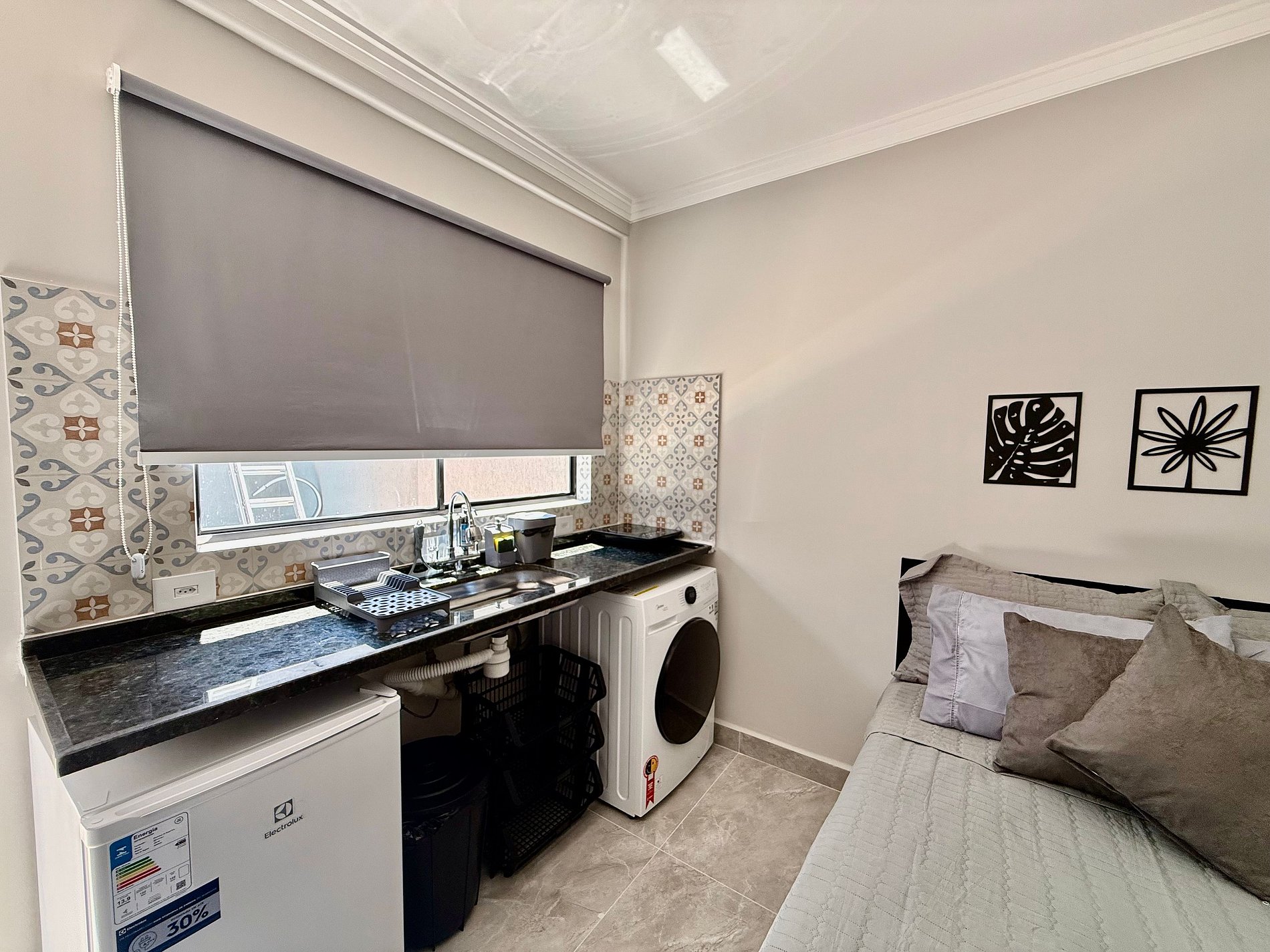 Todas as unidades possuem cozinha completa e máquina lava e seca dentro do apartamento. Os hóspedes também podem aproveitar a piscina compartilhada climatizada por energia solar, ideal para relaxar durante a estadia.