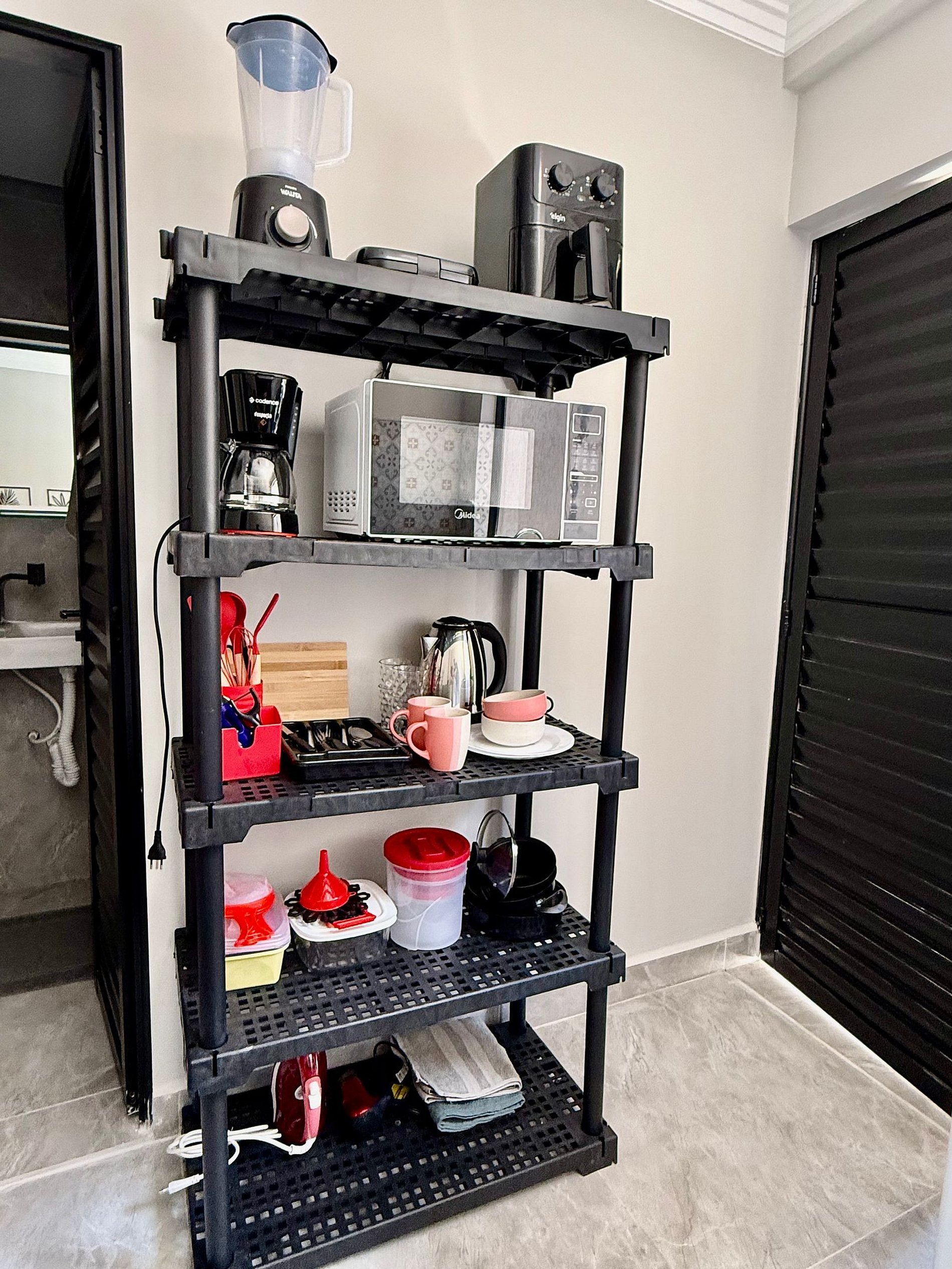A acomodação conta com cozinha completa e equipada com geladeira, fogão elétrico, micro-ondas, cafeteira, sanduicheira, airfryer, pratos, copos, talheres e utensílios, permitindo que os hóspedes preparem suas próprias refeições com facilidade. Para maior comodidade durante a estadia, o apartamento também possui máquina lava e seca, Wi-Fi rápido, Smart TV, e chuveiro quente.